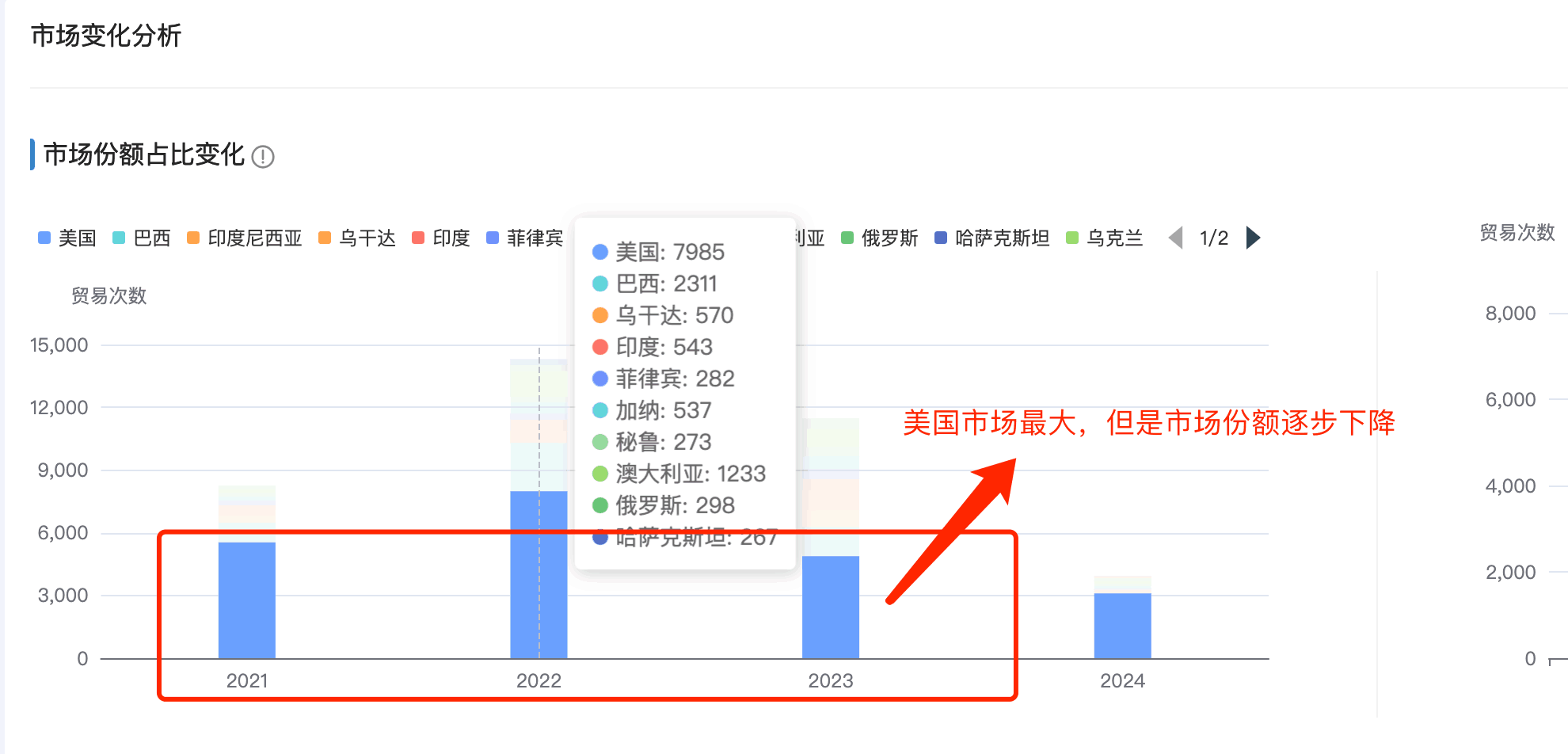 1. evo真人视讯商情洞察市场分析新增「市场占比变化分析」:分析每年的头部市场的占比排名和变化,哪些市场持续排名在头部,哪些市场排名逐渐下滑甚至消失在top之外的。